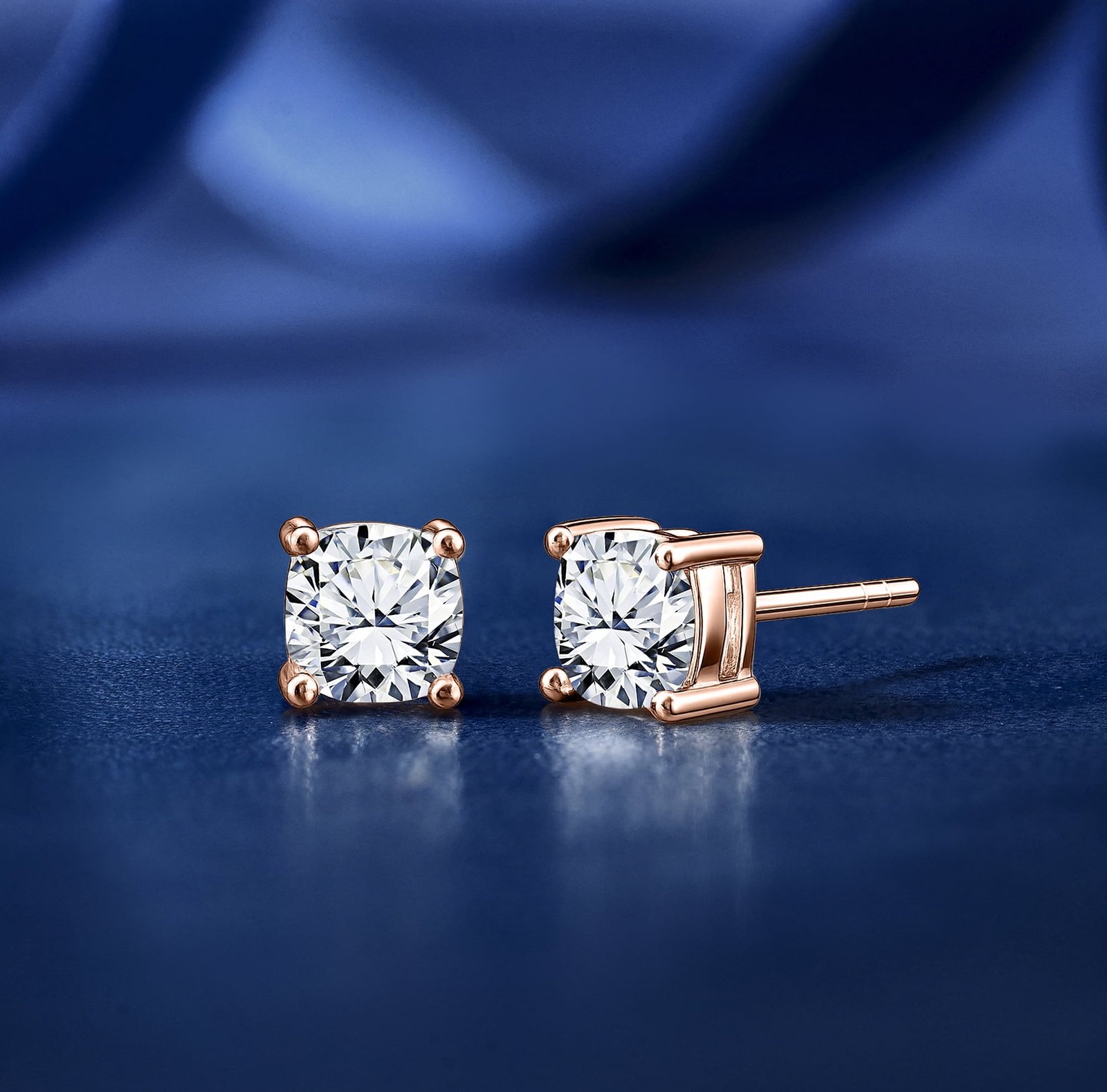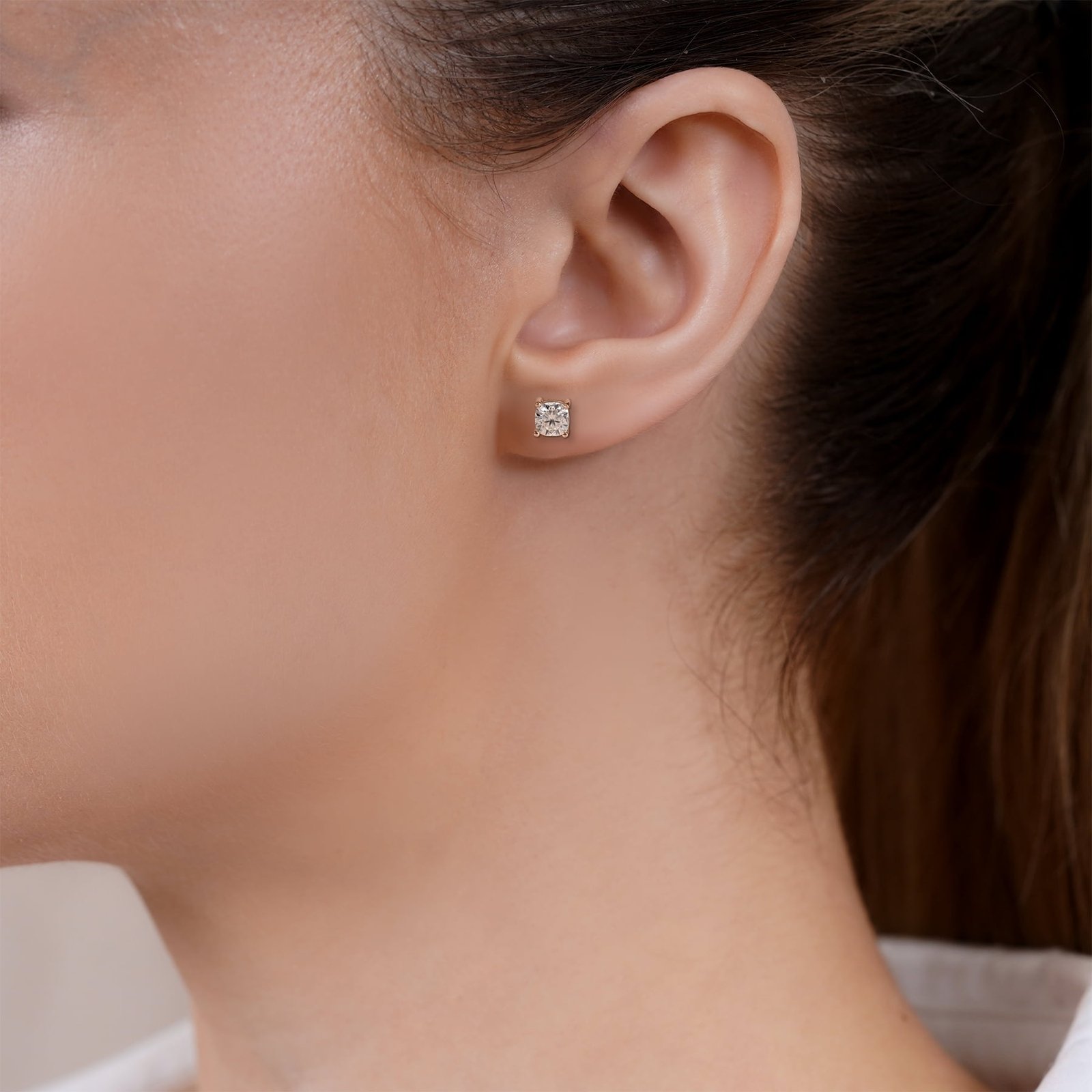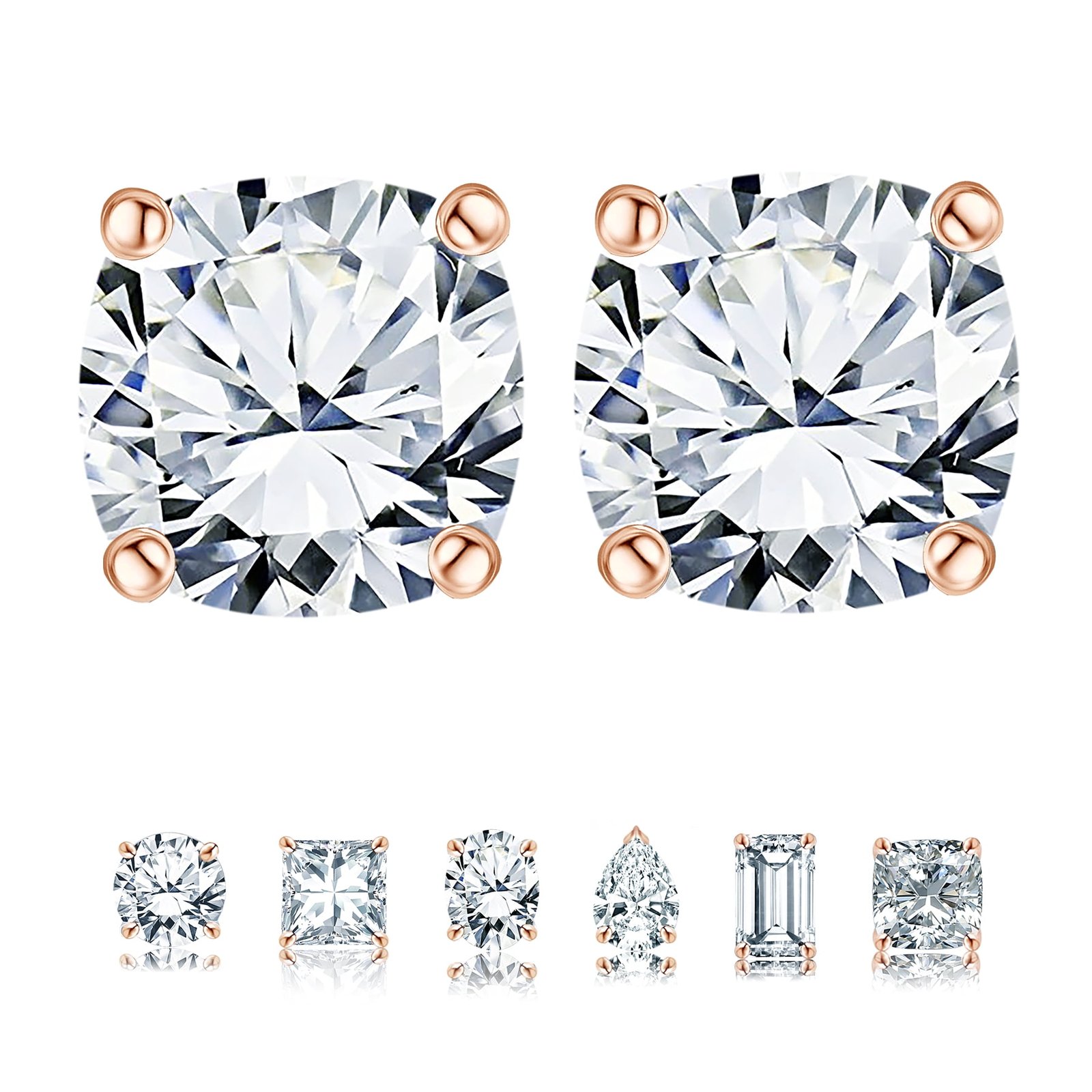 Embellish her ears with these 0.5 Carat Cushion Cut Moissanite 4 Prong Solitaire Stud Earrings In Rose Gold Plating. Professionally handcrafted into a fine cushion cut by our experts in lapidary, these beautiful moissanite stud earrings feature 0.5 carat moissanite on rose gold plating, and each side of the earrings weight 0.25 carat. Distinctive and extraordinary, these moissanite stud earrings is well-suited for those who are not quite into normal lifestyle. With naked eyes moissanites look, shine and feel exactly like diamonds. With its splendor, these moissanite earrings will enhance happiness and attract positive vibes. These earrings with moissanite gemstones are beautiful and accessible since it is available at an affordable price. Moissanites are the most popular alternative gemstone for diamonds while being at lower and more affordable price. If you are looking for a special gift for your friends or your better half, these solitaire stud earrings , the birthstone earring set for the fourth month, symbolizing an unbreakable love and strength, will surely be the best choice. Also, these moissanite earrings can be customized, so customers can choose one of metal colors between white gold plating, rose gold plating, and yellow gold plating. In regards to its hardness, moissanite is almost as hard as diamond which means that it is notably durable. Let’s fulfill your love story with these earrings with moissanite gemstones and, surely, she will not regret it.