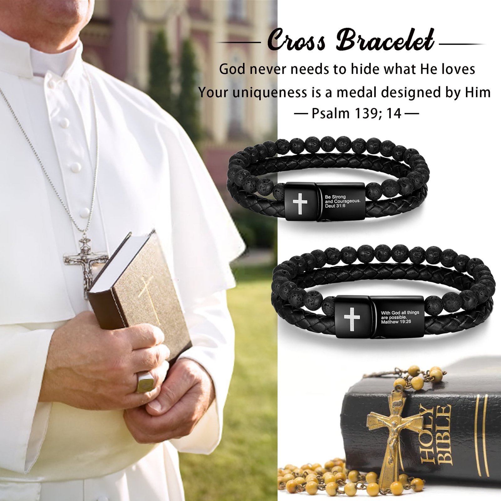- β Made of 3l6L stainless steel, natural volcanic stone and leather, finely ground and polished to show off the delicate luster and sturdy structure.The cross is not only a symbol of religious faith,but also represents the power of courage,hope and guardianship.