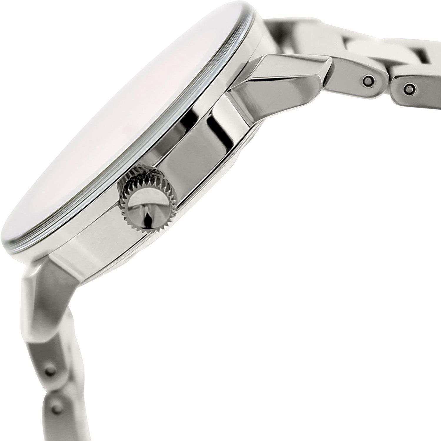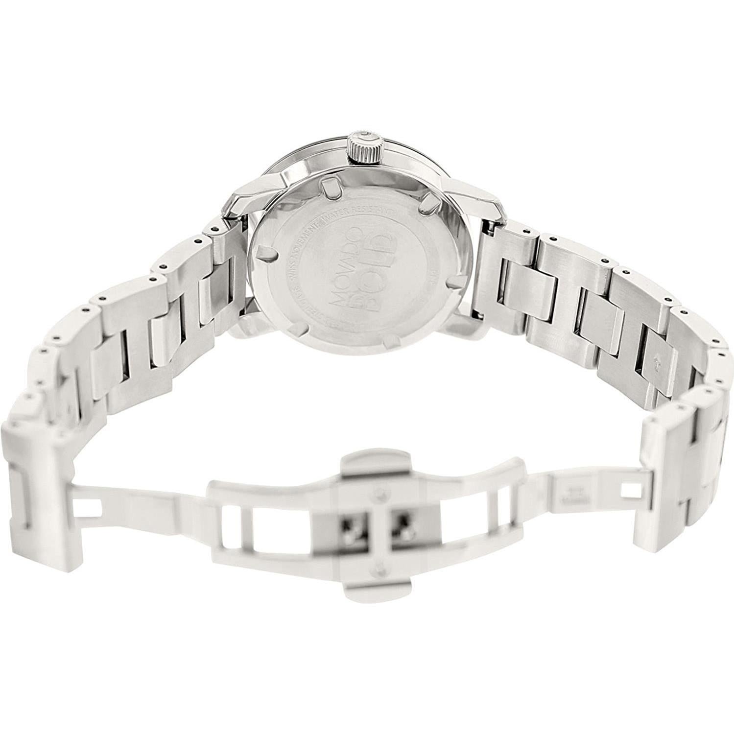 Silver dial enhanced by rose gold-tone hands. Silver-tone polished stainless steel case with a silver-tone stainless steel band. Quartz movement. 30 meters / 100 feet water resistance. Fixed bezel. Scratch Resistant Mineral crystal. Solid caseback. Deployment with Push Button Release clasp. Pull / Push crown. Case size 36 mm x 10 mm. Band 18 mm x 8 incheslong. Movado 3600084 Bold Watch.