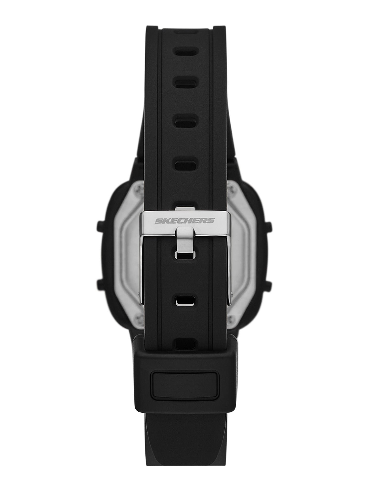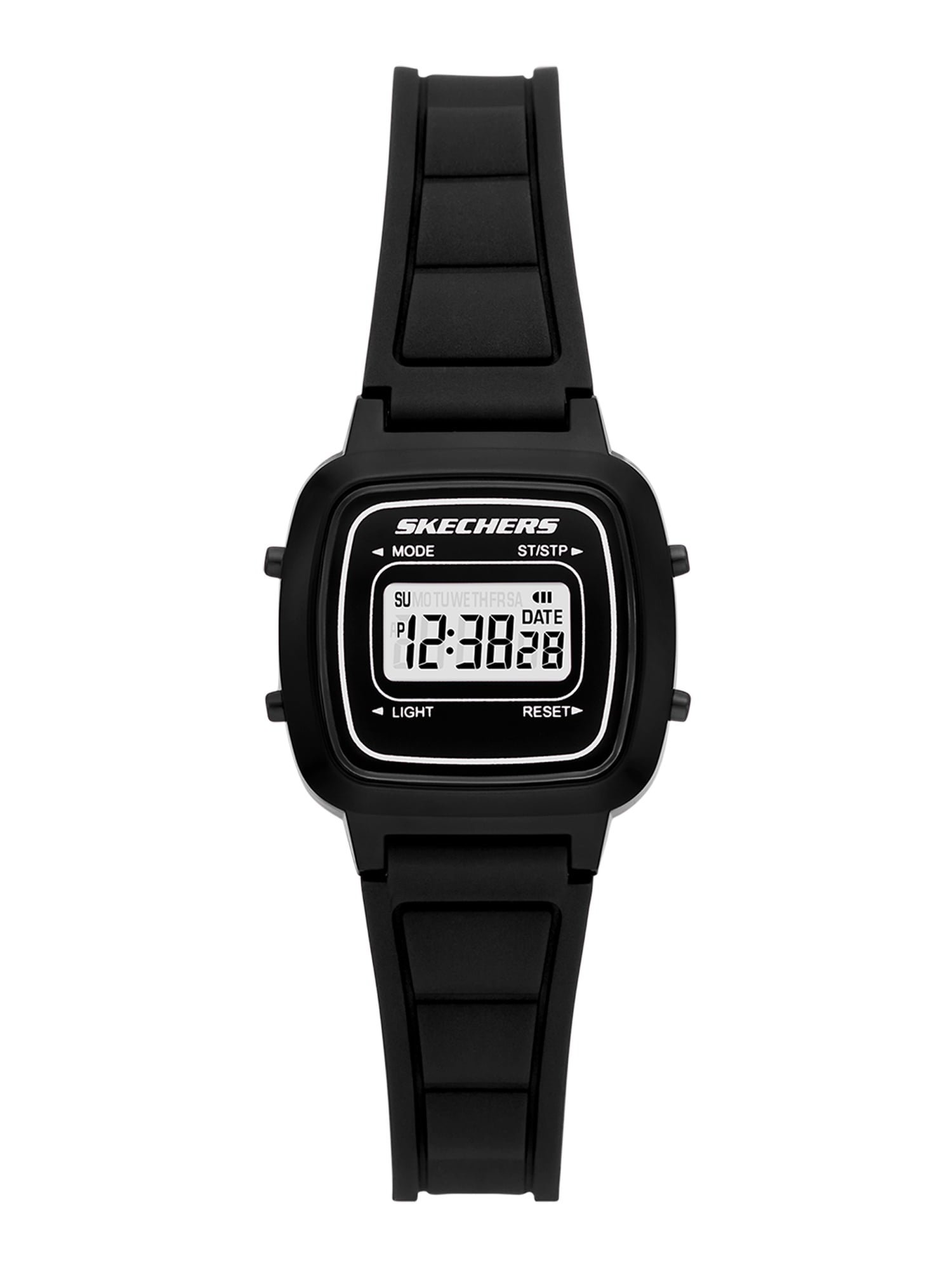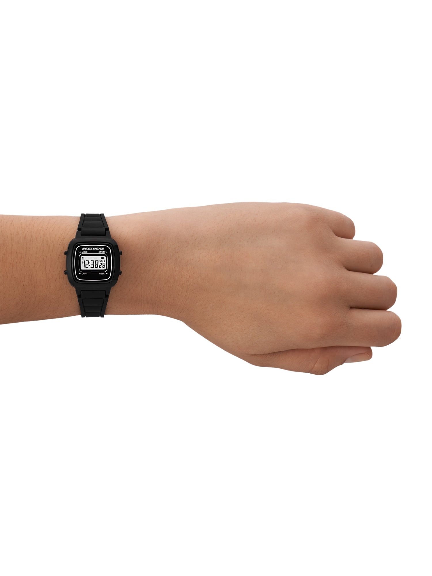 Sleek digital style in a compact square case. The Skechers Alta Digital watch is the ultimate in minimalist sport design. A matte black polyurethane strap anchors the 27mm case with mineral crystal. Bold digital display keeps you on time. Lightweight, water-resistant to 30 meters. Versatile wearability for an active lifestyle.